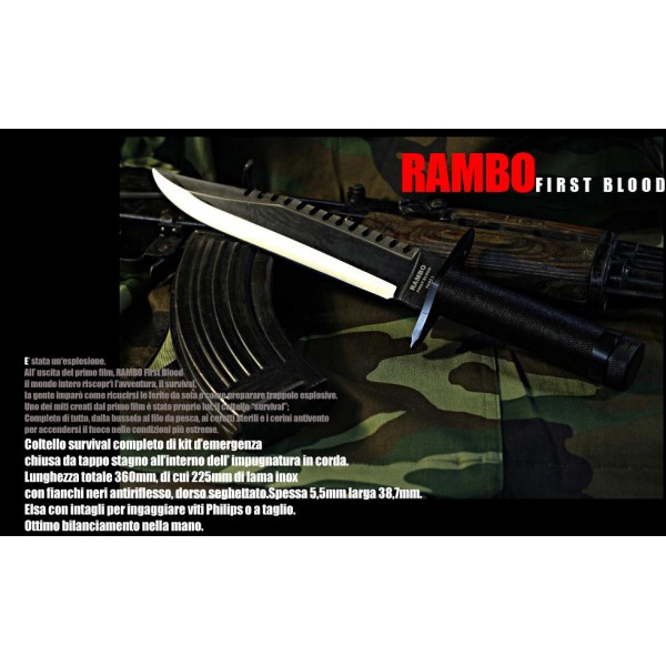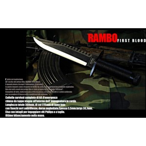 Coltello survival completo di kit d'emergenza chiusa da tappo stagno all'interno dell'impugnatura in corda. Lunghezza totale 360mm di cui 225mm di lama inox con fianchi neri antiriflesso, dorso seghettato. Spessa 5.5mm e larga 38.7mm