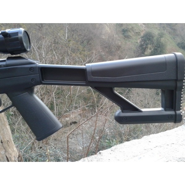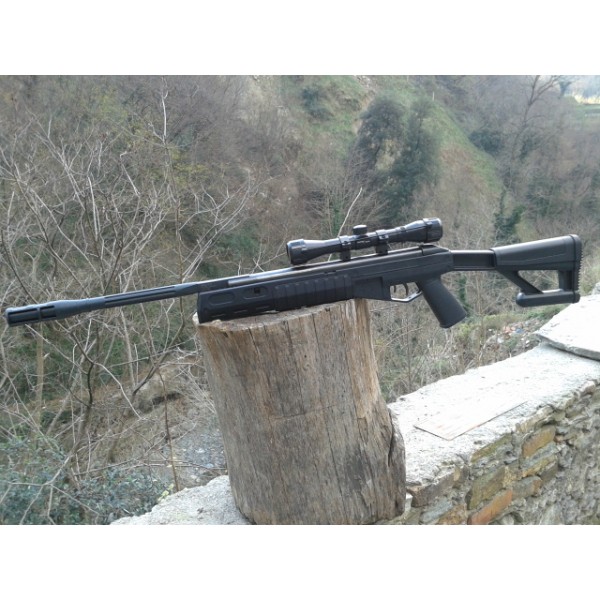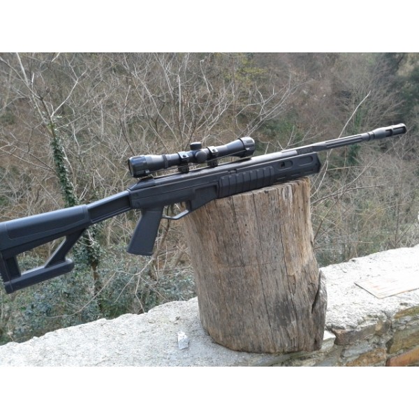 Il Crosman MTR77 in versione "tattica" con tecnologia Nitro Piston. Compatta,robusta e leggera,lunga 1020mm per 3kg circa con ottica montata,ha la meccanica completamente in acciaio.Calciatura in polimero non regolabile.Canna rigata cal. 4.5mm,sicura manuale,slitta da 11mm e ottica 4x32 mil dot inclusa.