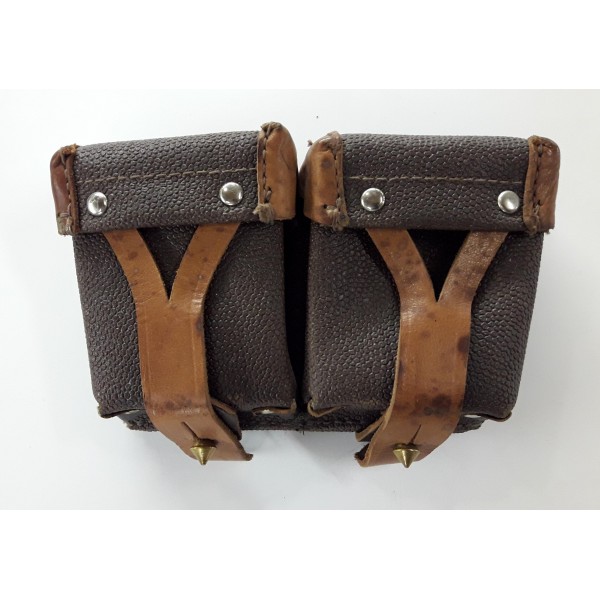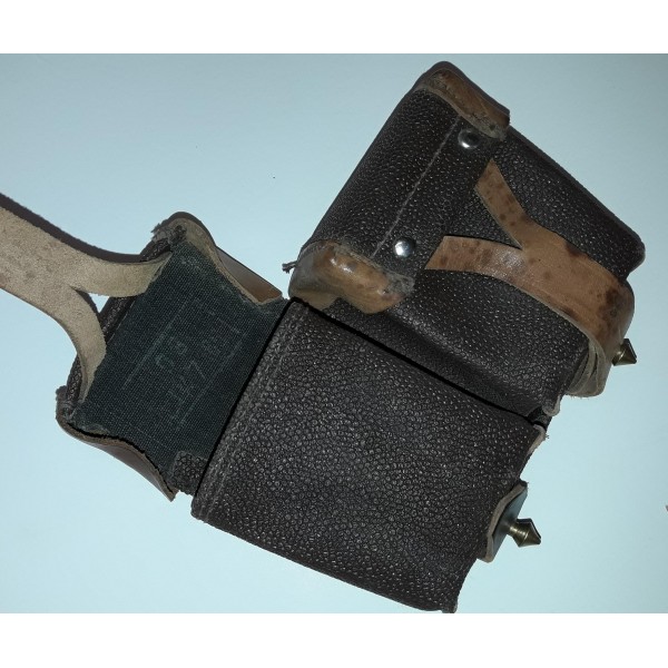 Giberna portalastrine a due scomparti per fucile Mosin Nagant, produzione Unione Sovietica anni '60. Proveniente da dismissioni arsenali militari Est Europa, inusata, qualche segno sugli spigoli esterni e segni di olio, interno nuovo, marchi chiaramente visibili.