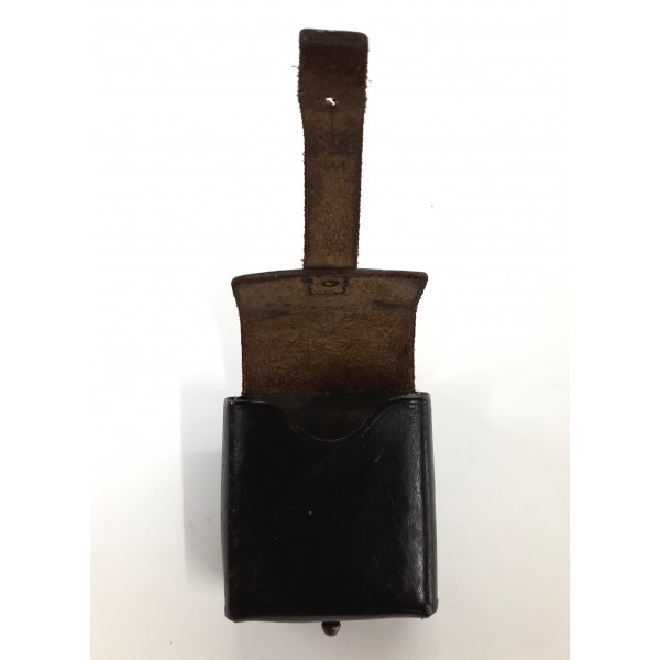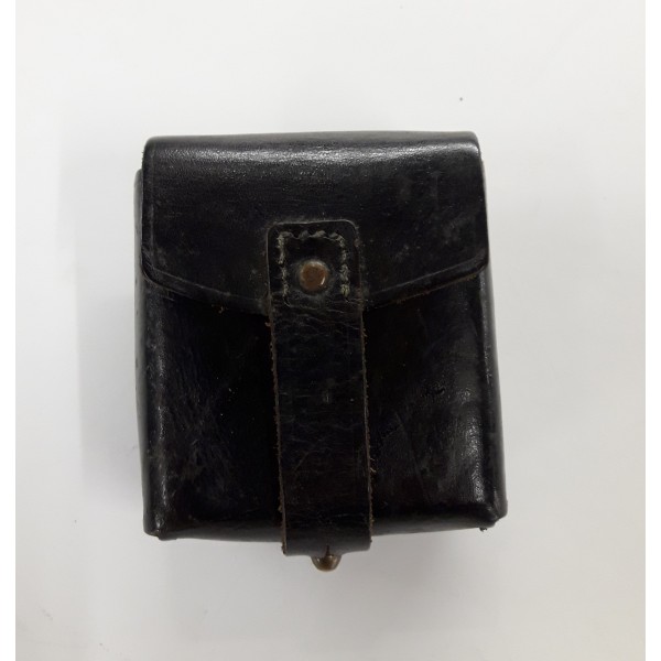 Giberna italiana in cuoio nero per due lastrine moschetto '91, prima guerra mondiale, Dimensioni esterne 90x85x35mm, interno rivestito in lamina metallica. Presenta una timbratura poco leggibile sotto la patta di chiusura. Condizioni ottime.