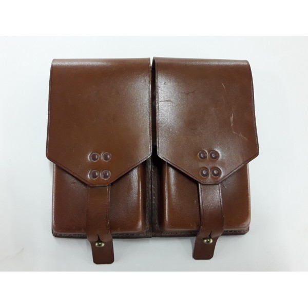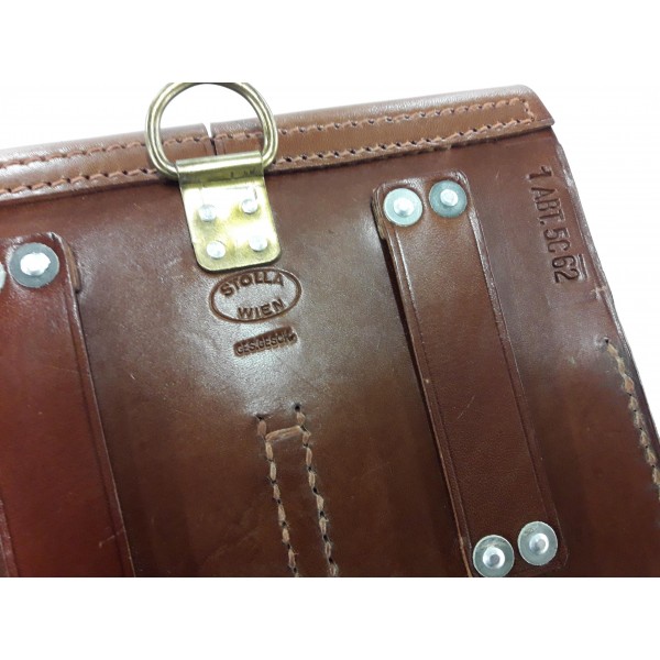Giberna a due tasche per caricatori del Fal austriaco STG58, con marchi produttore nella rara versione in cuoio marrone (generalmente si trova nera). Anni '50/'60, condizioni pari al nuovo.